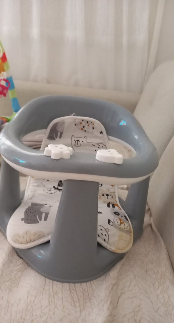 Gri renkli bebek mama sandalyesi, hayvan desenli yumuşak oturma minderi ile rahat ve destek sağlar.