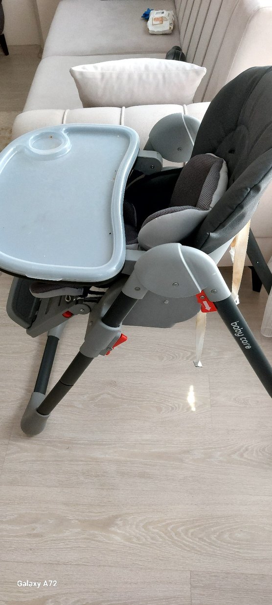 Gri renkli bebek mama sandalyesi, geniş tepsi ve konforlu yastıklı oturma alanına sahiptir. Dayanıklı ayakları ve ayarlanabilir parçaları bulunur.