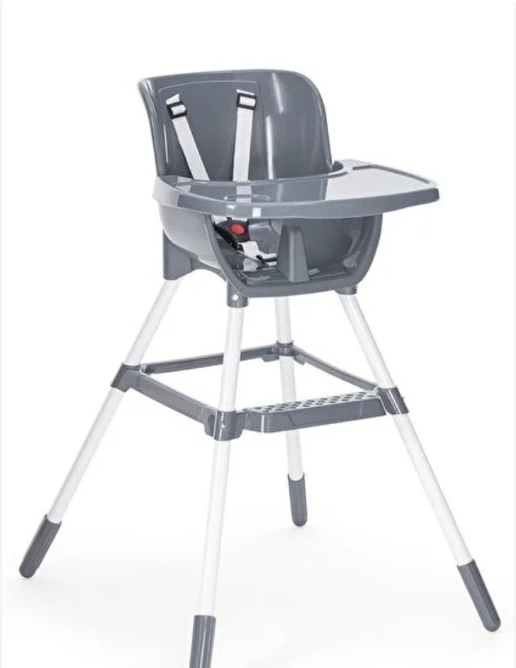 Gri renkli bebek mama sandalyesi, güvenlik kemeri ve çıkarılabilir tepsi ile kolay temizlenir. Dayanıklı ayaklar ve ayak desteği bulunur. ️