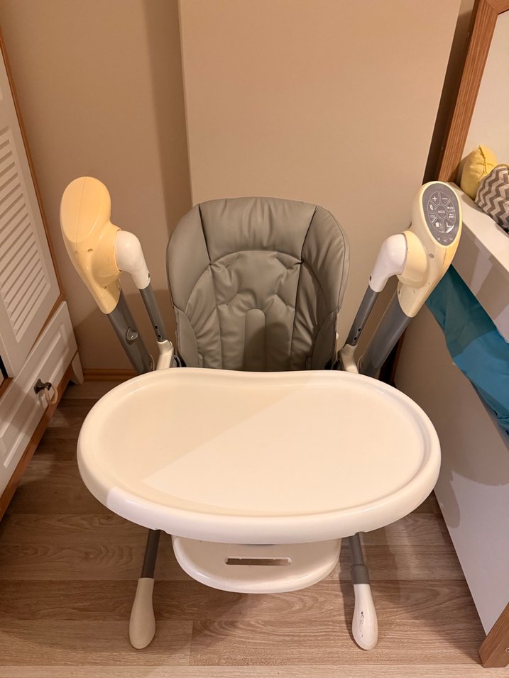 Gri renkli, yumuşak dolgulu oturma alanı ve kolay temizlenebilir çıkarılabilir tepsiye sahip bebek mama sandalyesi.