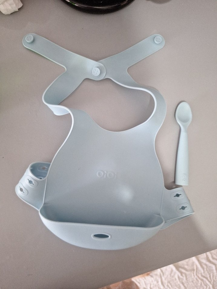 Ayarlanabilir boyun askısına sahip, yumuşak ve esnek malzemeden gri bebek önlüğü, döküntüleri yakayan cepli ve kaşıkla birlikte gelir.