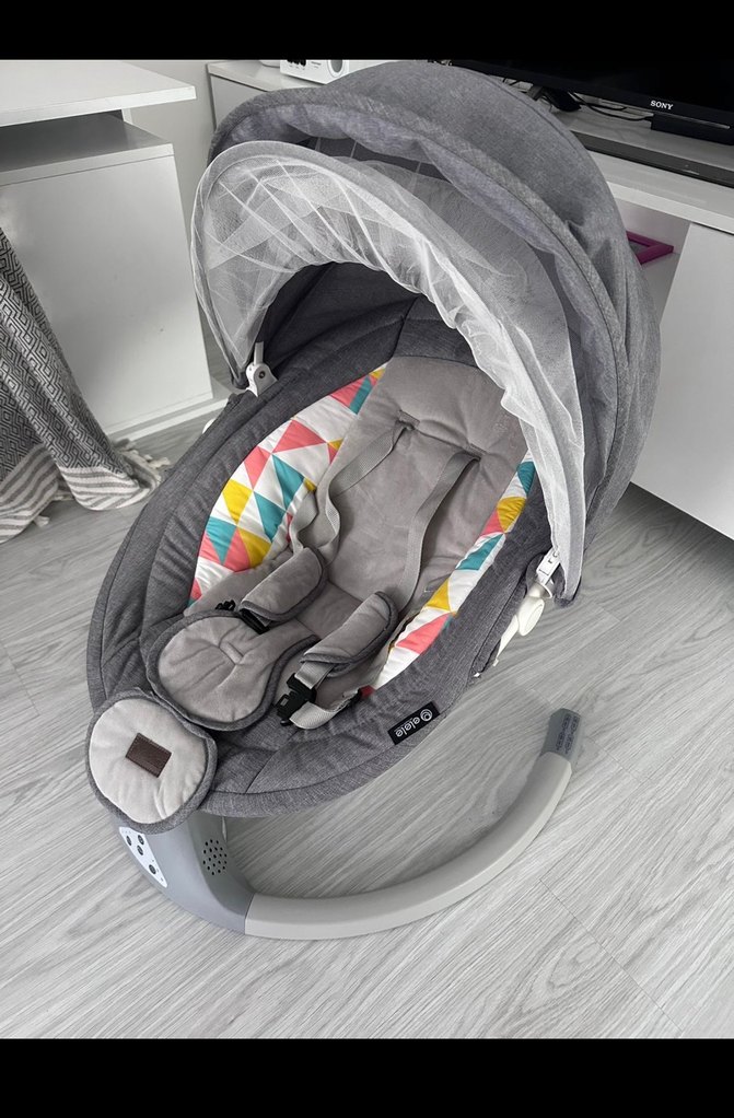 Yumuşak dolgulu, ayarlanabilir emniyet kemerli gri bebek ana kucağı . Sinek teline sahip tente ve sağlam taban içerir. Sallanabilir müzikli. Hiçbir sorun yoktur