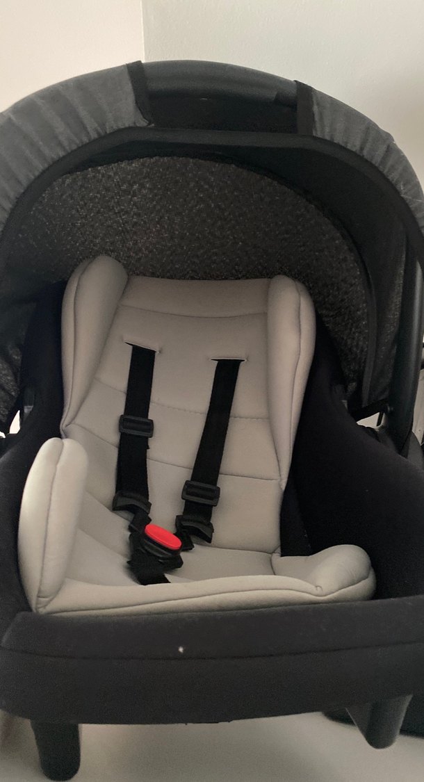 Yanları dolgulu ve ayarlanabilir emniyet kemerli gri bebek oto koltuğu, güvenli ve konforlu seyahat sağlar.