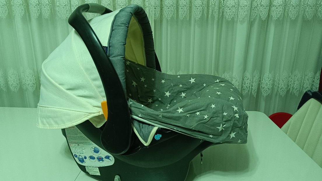 Yıldız desenli kaplaması ve rahat dolgulu iç kısmıyla gri bebek oto koltuğu, taşıma için sağlam saplıdır. ⭐
