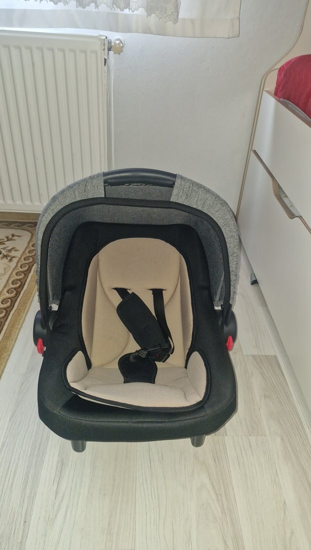 Gri renkli, bej iç yastıklı ve ayarlanabilir emniyet kemerli bebek oto koltuğu. Taşıması kolay ve güvenli seyahat sağlar.