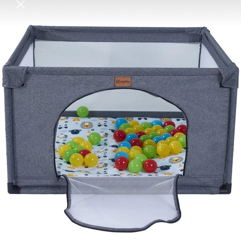 Gri oyun parkı, yumuşak renkli minderi ve havalandırma sağlayan file yanları ile dikkat çeker. Önde kolay erişim için file kapaklı açılır bölüm bulunur.