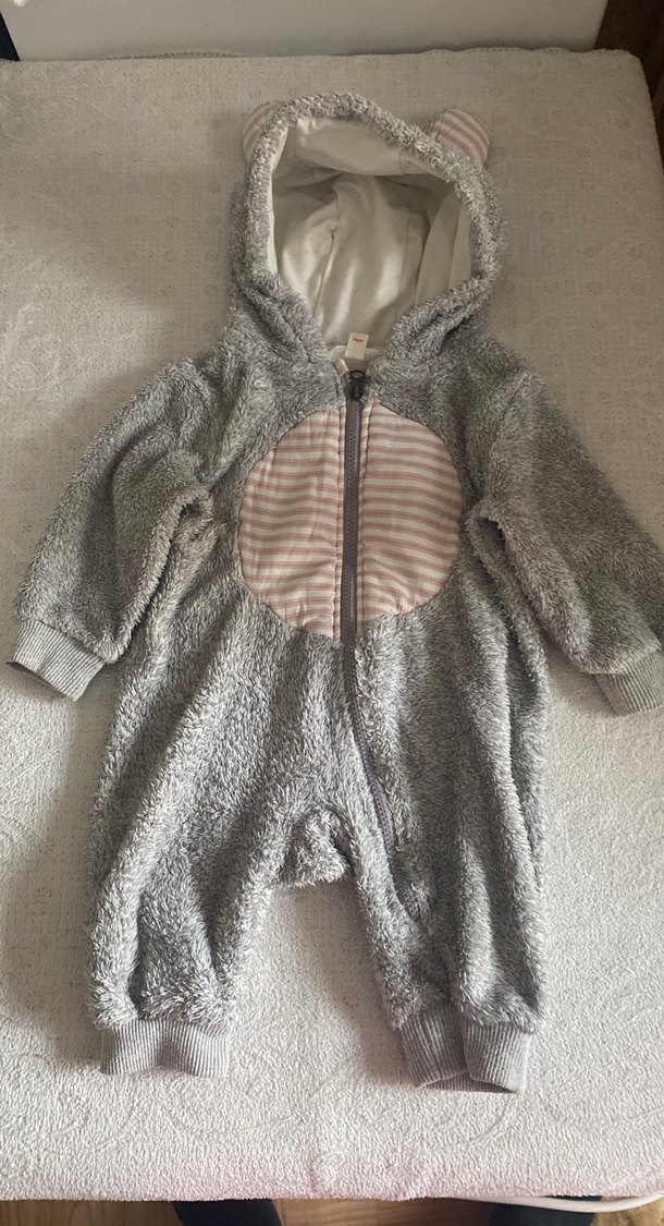 Gri renkte, yumuşak ve sıcak peluş kumaştan yapılmış kapüşonlu bebek tulumu. Önünde fermuar ve çizgili iç astar bulunur.
