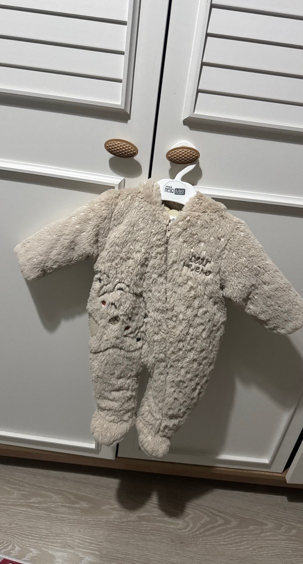 Gri renkli bebek tulumu, yumuşak peluş kumaştan olup kürklü detaylar ve nakışlı ayıcık desenleri içerir. Kapüşonlu ve ayakları kapatır, sıcak tutar.