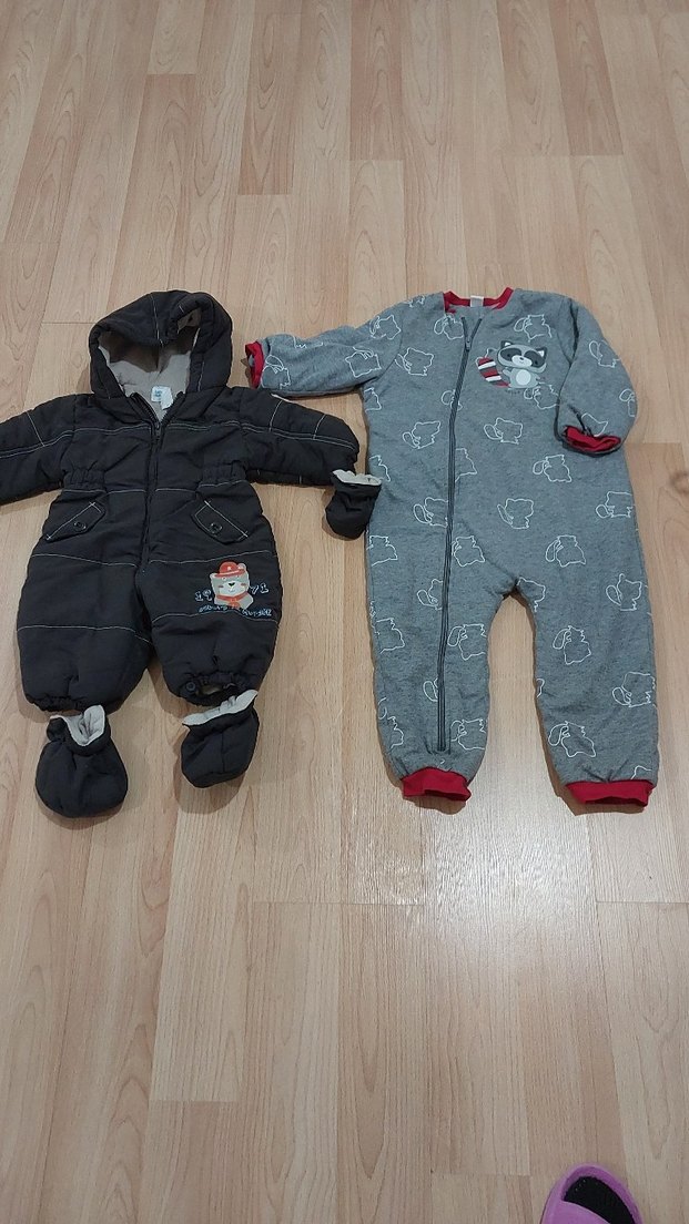 Gri polar bebek tulumu ve siyah kapüşonlu kürklü bebek montu, soğuk havalar için sıcaklık ve rahatlık sağlar. ❄️