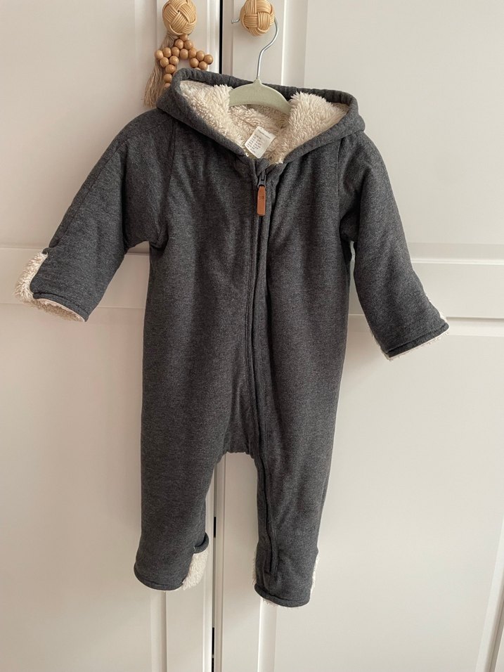 Gri renkli bebek erkek tulumu, yumuşak ve sıcak polar kumaştan yapılmıştır. Kapüşonlu ve düğmeli manşetlere sahiptir. Herhangi bir sorunu yoktur. Çok severek kullandık. 4-6 ay pazarlık yoktur