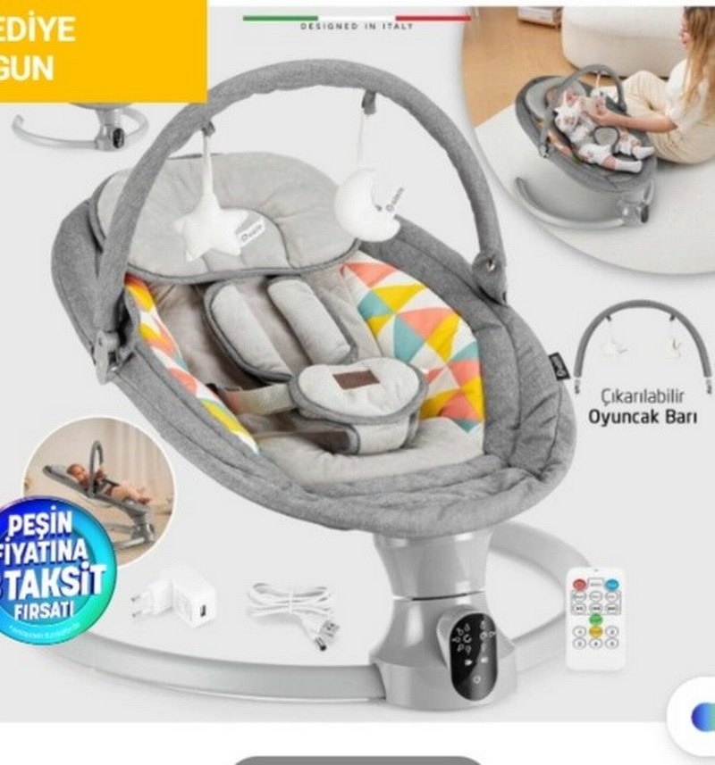 Gri bebek salıncağı, yumuşak dolgulu oturma alanı ve renkli geometrik desen içerir. Çıkarılabilir oyuncak çubuğu ve uzaktan kumanda ile kullanımı kolaydır. İtalya'da tasarlanmıştır.