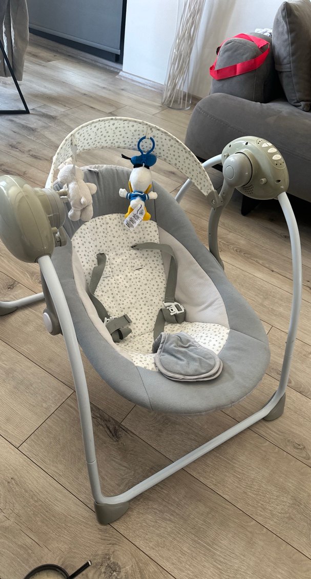Yumuşak dolgulu ve emniyet kemerli gri bebek salıncağı. Oyuncak çubuğunda asılı peluş oyuncaklar bulunur. Dayanıklı iskelet ve konforlu tasarım.