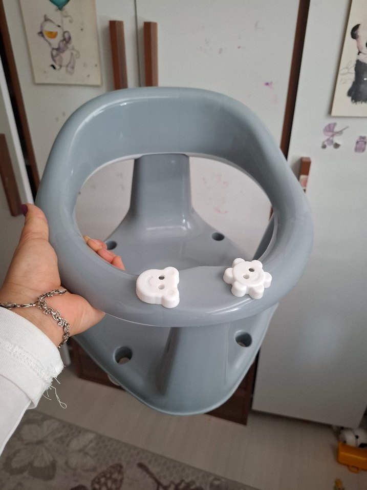 Gri renkte, sağlam plastikten yapılmış, güvenlik düğmeleri bulunan bebek mama sandalyesi.