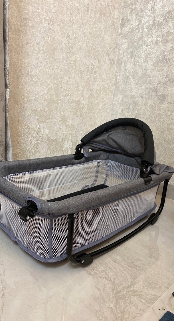 Gri renkli bebek beşiği, nefes alabilen file yanlar ve hareket kolaylığı sağlayan tekerlekli sağlam siyah çerçeveye sahiptir hiç kullanılmamıştır