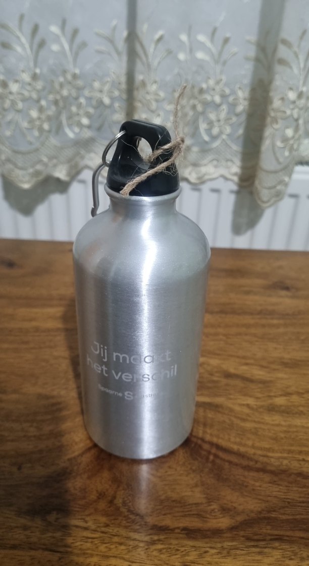 Gri renkli bebek suluk, dayanıklı metal gövde ve güvenli siyah kapak ile taşıma halkası içerir.