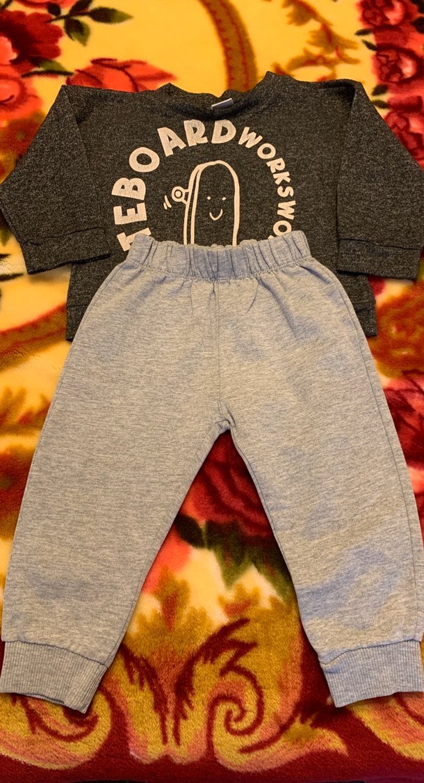 Uzun kollu gri üstü baskılı kaykay deseniyle, belden lastikli yumuşak ve sıcak pantolonla tamamlanan bebek takımı.