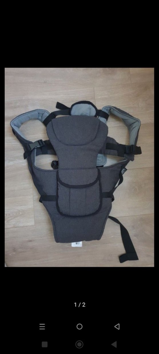Ayarlanabilir kayışları ve yastıklı destek kısmı ile gri bebek taşıma aparatı. Rahat ve güvenli taşıma sağlar.