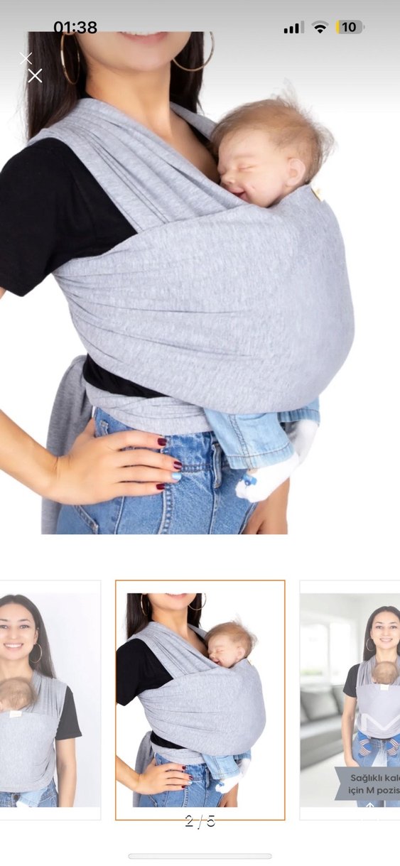 Yumuşak kumaştan yapılmış gri bebek taşıma sling'i, bebeği rahatça taşımak için tasarlanmıştır.