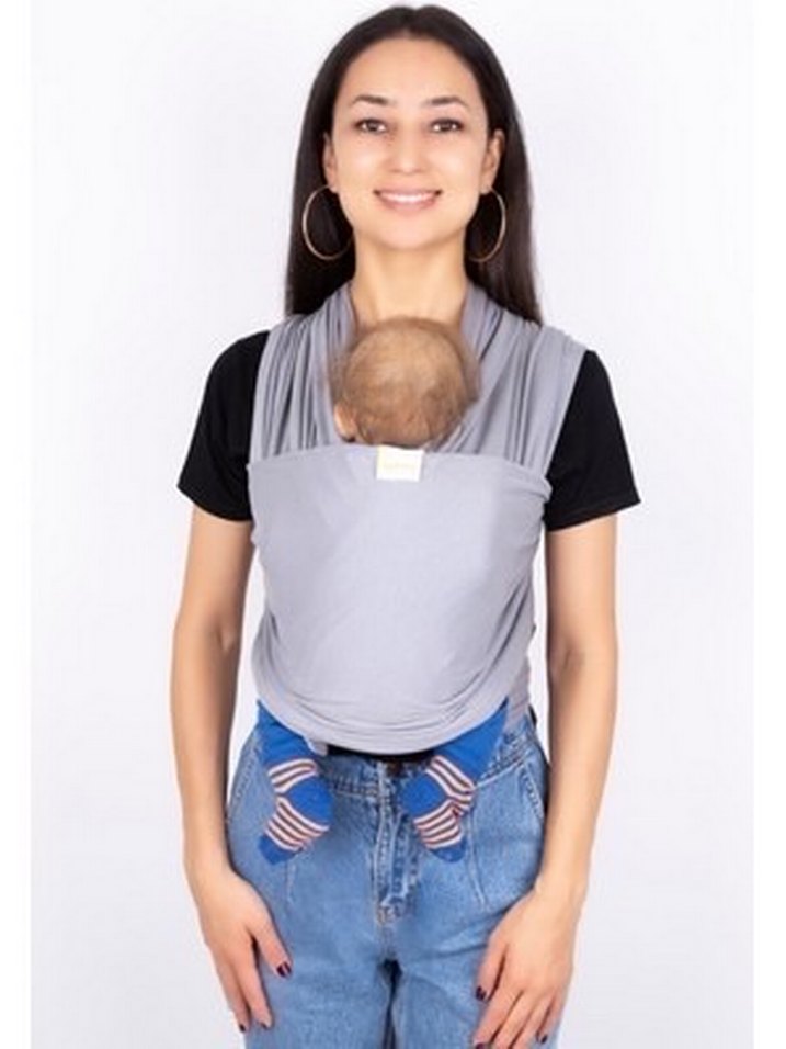 Yumuşak kumaştan üretilmiş gri bebek taşıma slingi, bebeğinizi rahatça taşımanızı sağlar ve ellerinizi serbest bırakır.