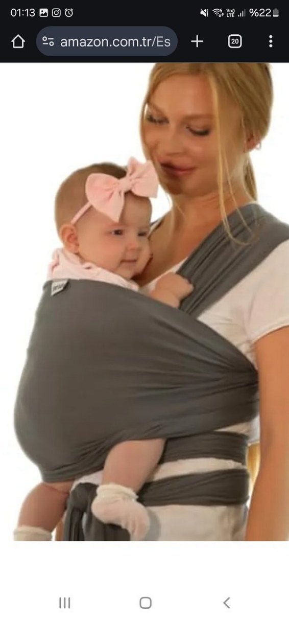Gri renkli, yumuşak ve esnek kumaştan yapılmış bebek taşıma slingi, bebeği rahat ve güvenli bir şekilde taşımayı sağlar.