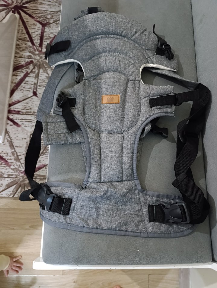 Ayarlanabilir kayışlara ve rahatlık için dolgulu desteğe sahip gri bebek taşıyıcı. Bebeğinizi güvenle taşımak için tasarlanmıştır.