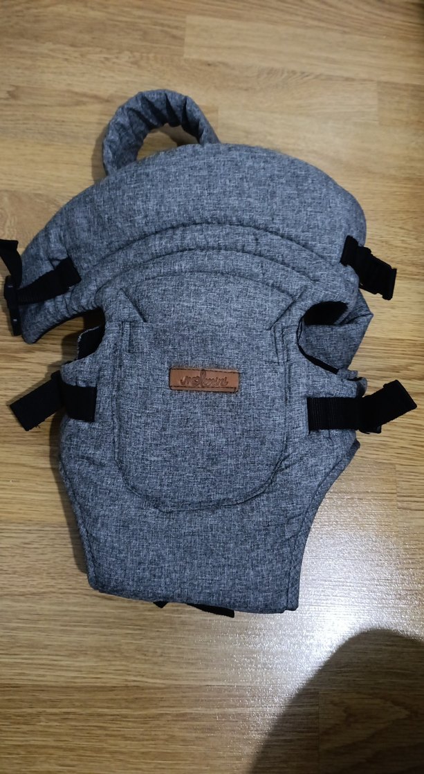 Gri renkli bebek taşıyıcı, ayarlanabilir kayışlar ve konforlu dolguya sahiptir. Bebek için ergonomik destek sağlar.