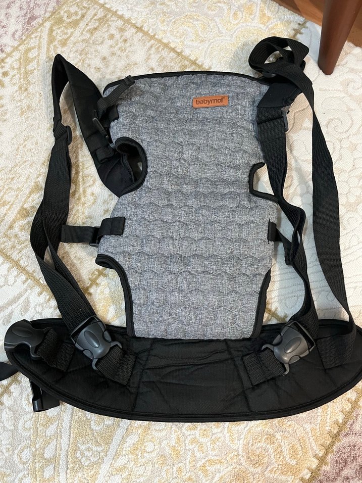 Ayarlanabilir askıları ve dolgulu bel kemeriyle rahat taşıma sağlayan gri Babymol bebek taşıyıcı. Bebeği güvenli şekilde destekler.