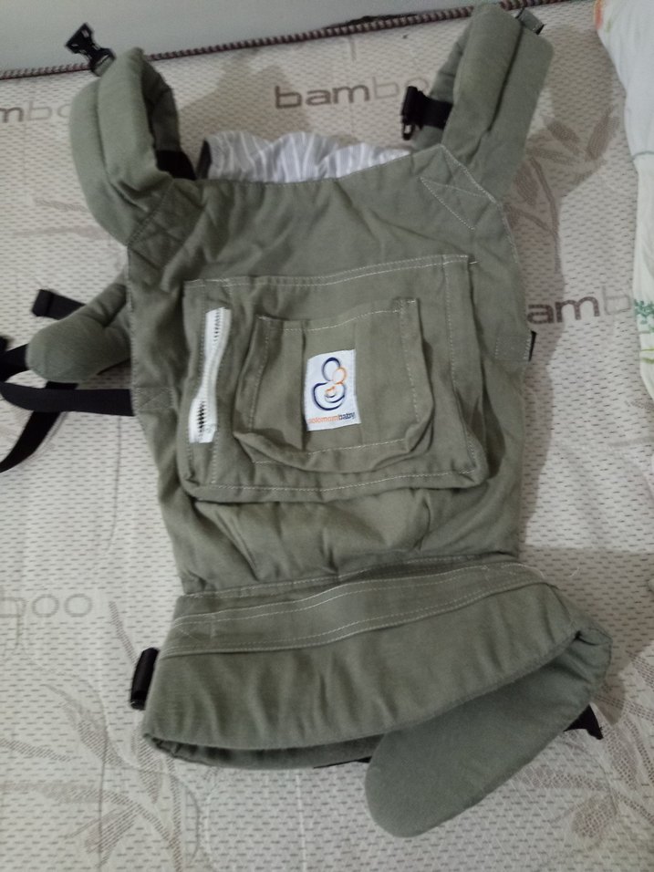 Bam logosu bulunan, cepli ve dolgulu askılı gri bebek taşıyıcı. 3 20 kilo taşıma kapasiteli fazla kullanılmadı