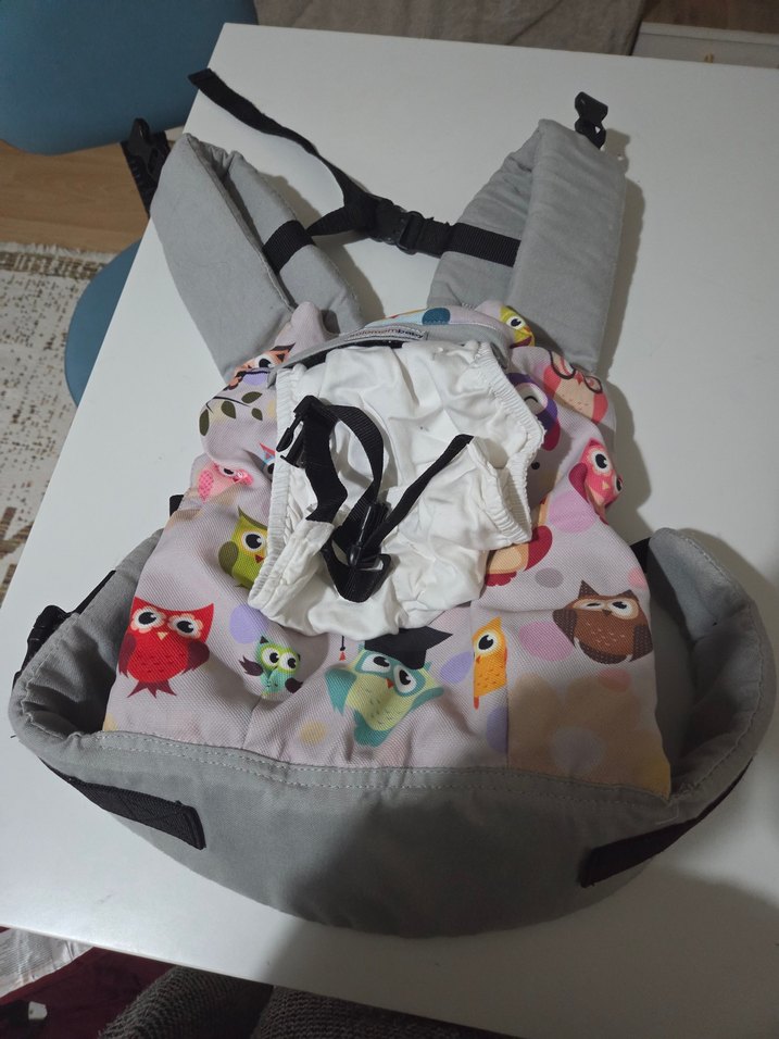 Renkli baykuş desenli gri bebek taşıyıcı, yastıklı askılar ve ayarlanabilir tokalar ile rahat ve güvenli kullanım sağlar.
