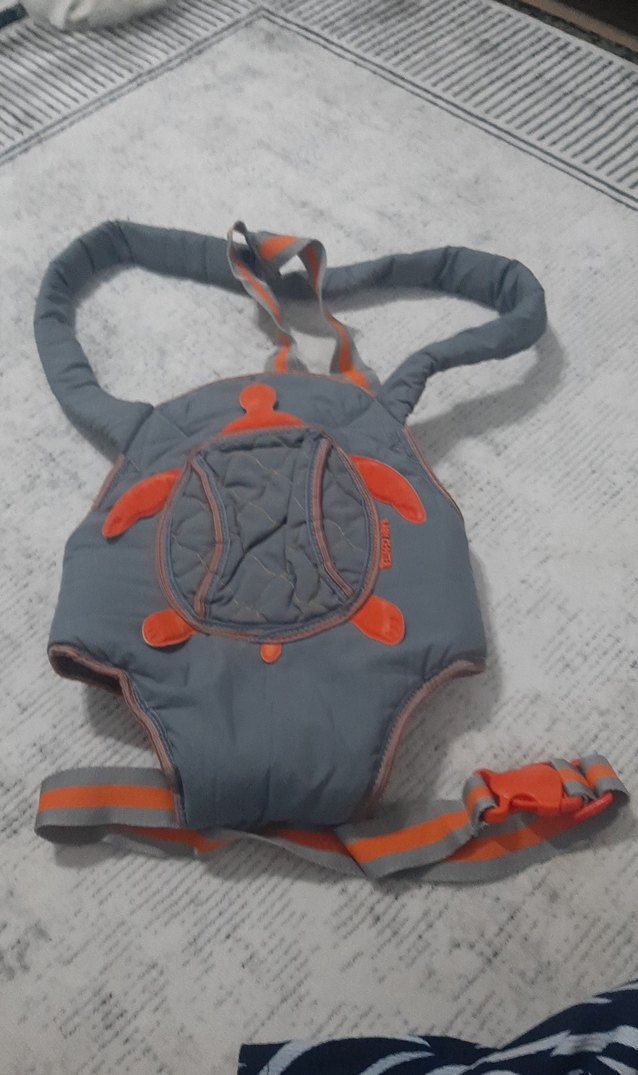 Gri ve turuncu detaylı, ayarlanabilir askılı yumuşak bebek taşıyıcı kanguru. önünde küçük bir cep var resimlerde mevcut sıkıntısız fiyat sondur