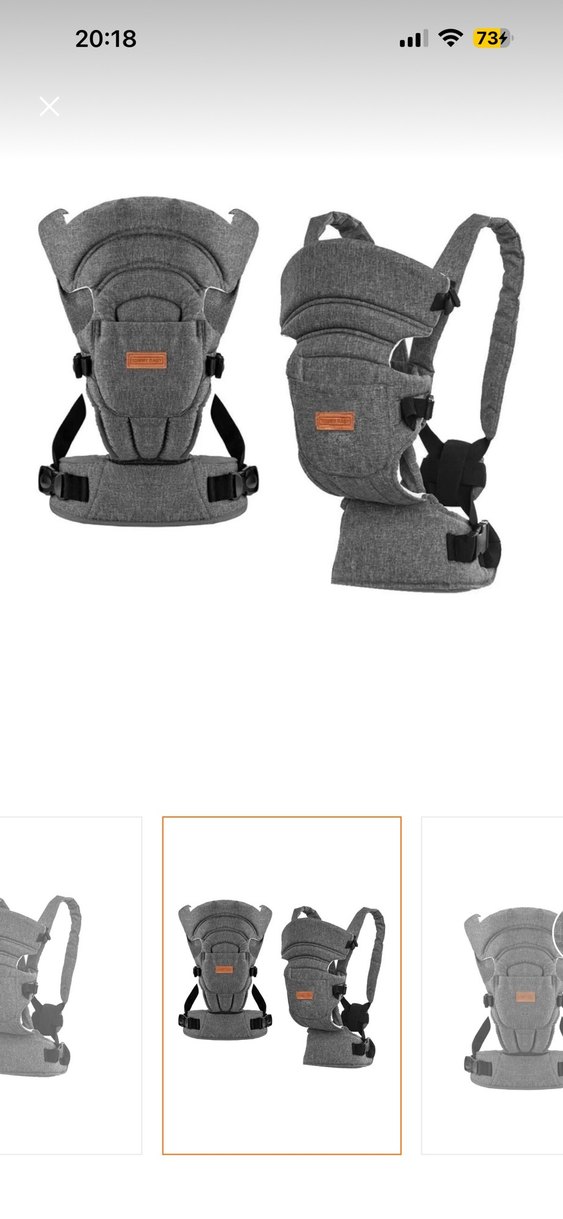 Gri renkli bebek taşıyıcı, ayarlanabilir tokalar ve yumuşak kumaş ile konfor sağlar. Farklı taşıma pozisyonlarını destekler.