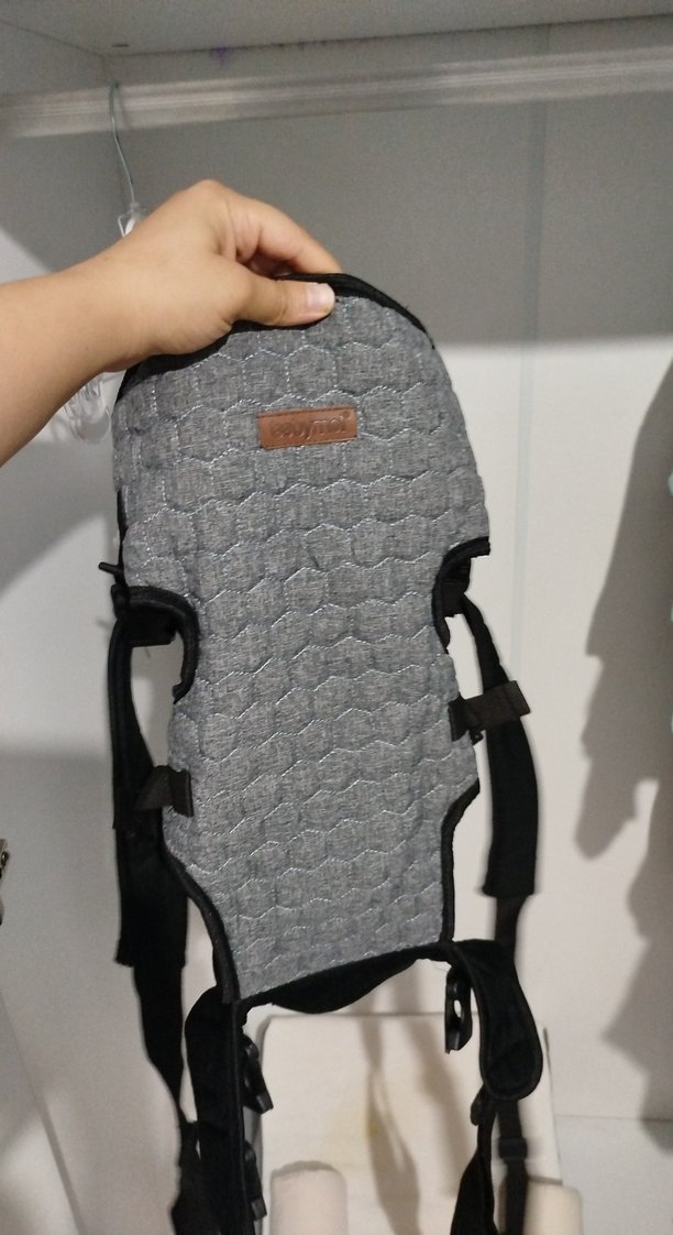 Yumuşak, kapitone gri kumaştan yapılmış, ayarlanabilir kayışlara sahip bebek taşıyıcı kanguru. Bebek güvenliğini sağlar ve ellerinizi serbest bırakır.