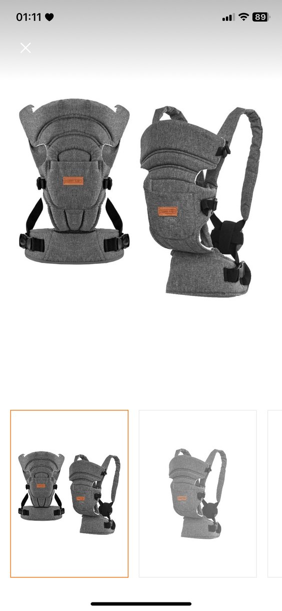 Gri renkli bebek taşıyıcı, konfor için dolgulu askılar ve destekleyici bel kemeri içerir. Ayarlanabilir yapısıyla bebeği güvenle tutar.