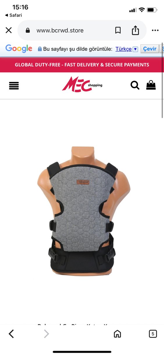 Gri renkli bebek taşıyıcı, ayarlanabilir kayışlar ve yumuşak destek sunar. Güvenli ve rahat taşıma sağlar.