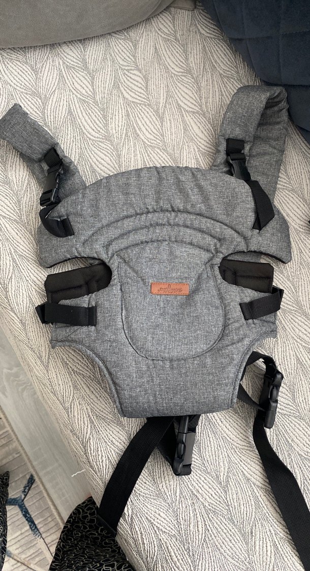 Ayarlanabilir askıları ve yastıklı desteği olan gri bebek taşıyıcı kanguru, konforlu ve ergonomik taşıma sağlar.