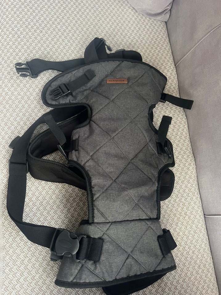 Ayarlanabilir kayışlara ve yumuşak dolgulu desteklere sahip gri bebek taşıyıcı kanguru. Güvenli ve ergonomik taşıma sağlar.