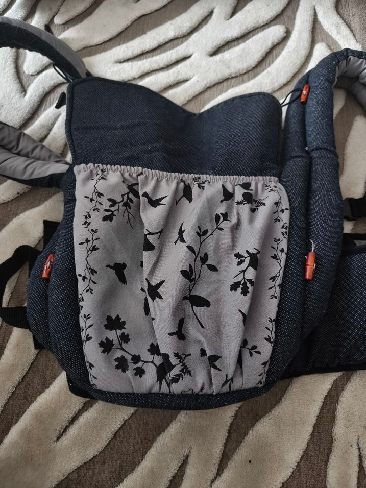 Çiçek ve kuş desenli cep detayına sahip gri bebek taşıyıcı. Ayarlanabilir askıları ile rahat kullanım sağlar.