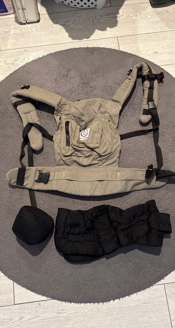 Ayarlanabilir askılar ve yastıklı destekle konforlu taşıma sağlayan gri bebek taşıyıcı.