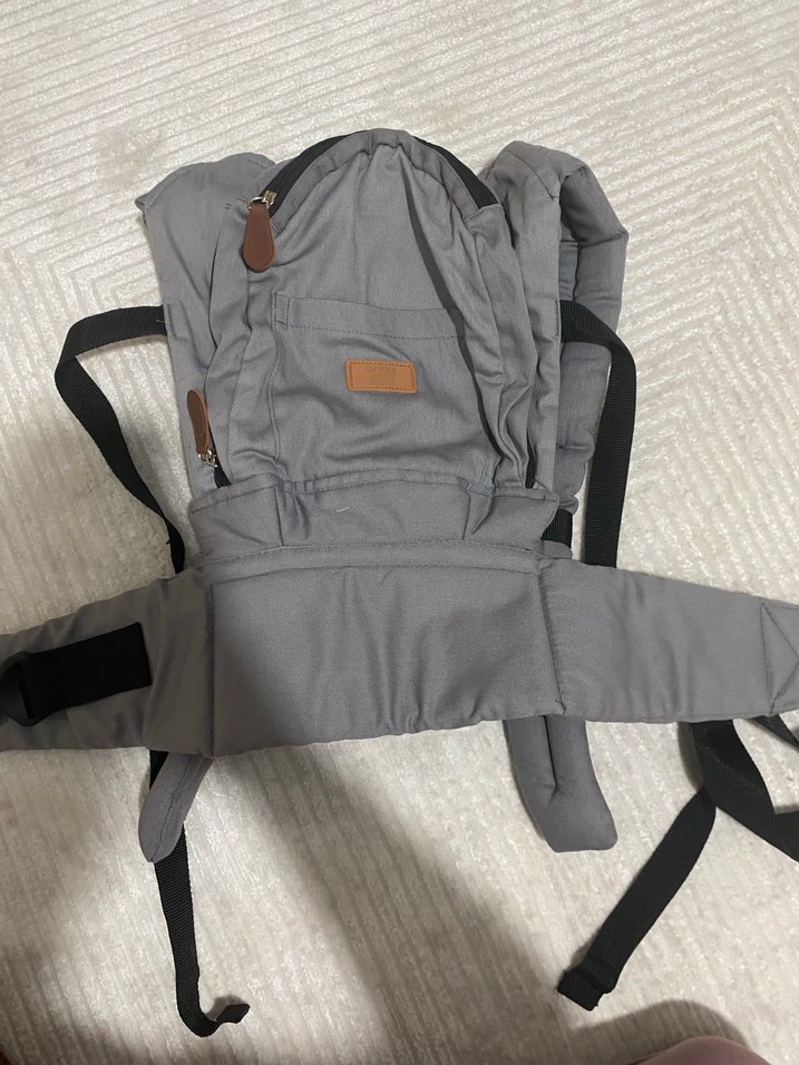 Ayarlanabilir askılar ve yastıklı bel kemeri ile rahat taşıma sağlayan gri bebek taşıyıcı kanguru.
