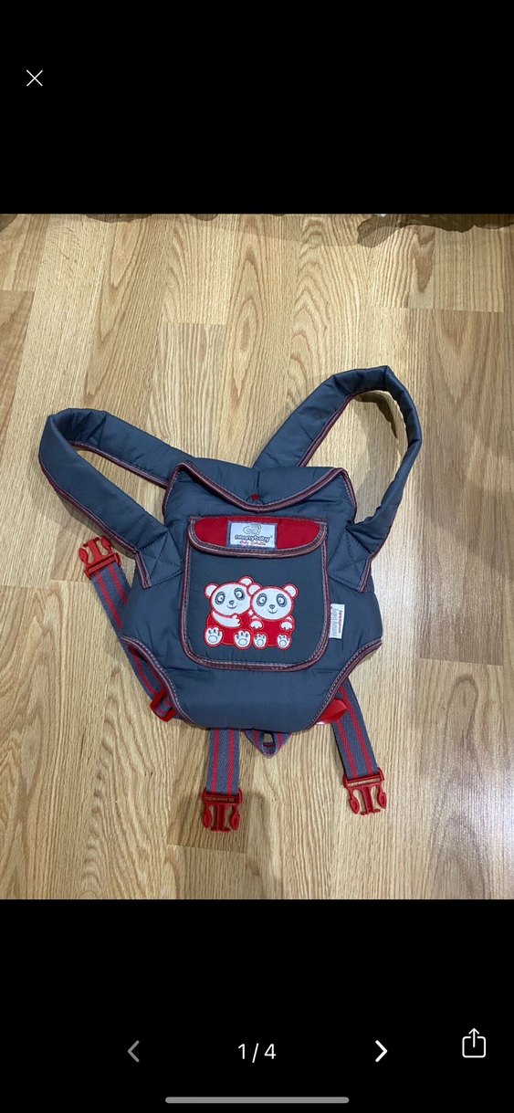 Ayarlanabilir tokalar ve dolgulu omuz askıları olan gri bebek taşıyıcı kanguru, ön cepte sevimli panda desenli.