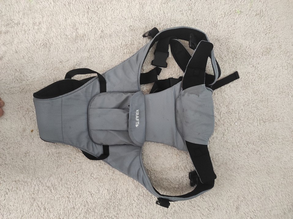 Ayarlanabilir askılı ve yastıklı destekli KRAFTs gri bebek taşıyıcı, konforlu taşıma sağlar. Yeni doğan ve küçük çocuklar için uygundur.