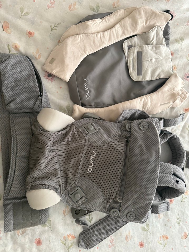 Nuna marka gri bebek taşıyıcı, yumuşak dolgulu askılar ve nefes alabilir kumaş ile rahat taşıma sağlar. Yenidoğan ile uyumlu kanguru