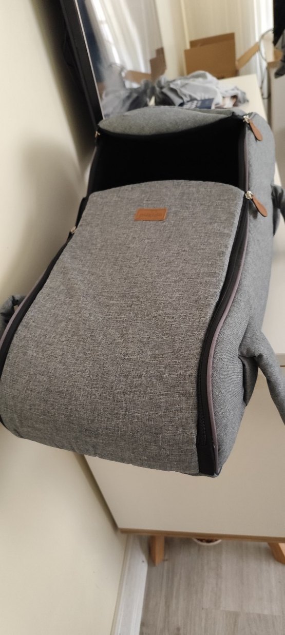 Yumuşak dokulu kumaş ve fermuarlı bölmeleri olan gri bebek taşıyıcı. Rahat ve kullanışlıdır.