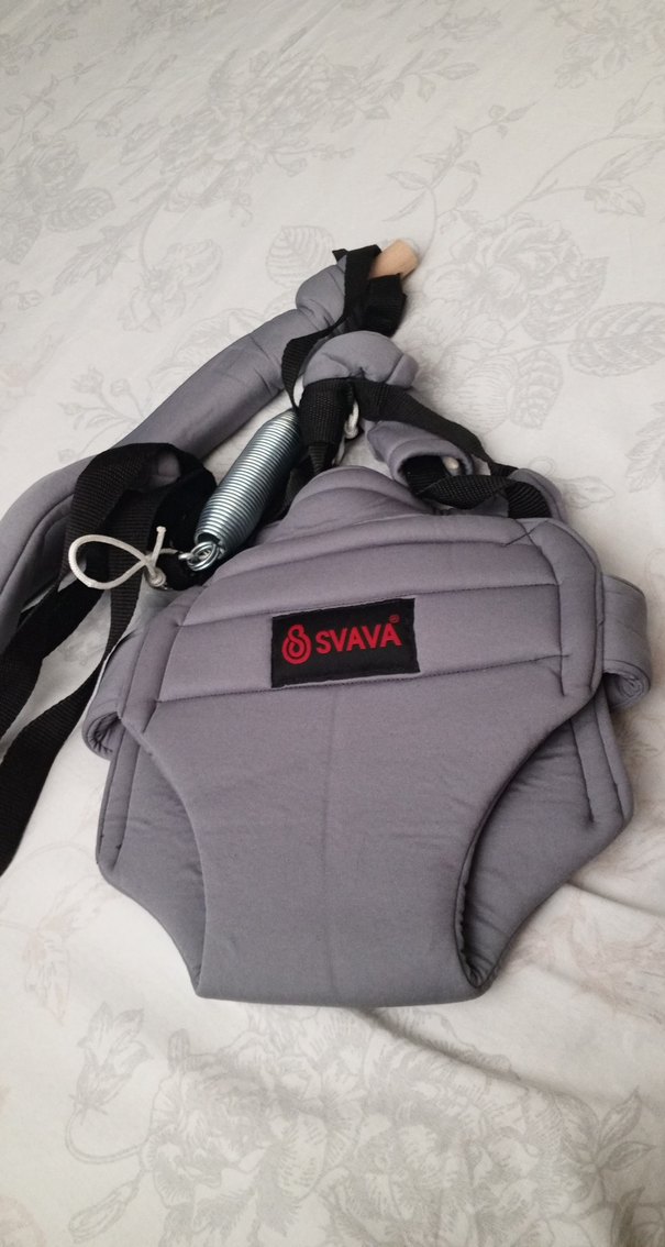 Ayarlanabilir askıları ve yumuşak dolgusu olan gri bebek taşıyıcı. SSVAVA marka etiketi bulunur. hiç kullanılmadı zıp zıp