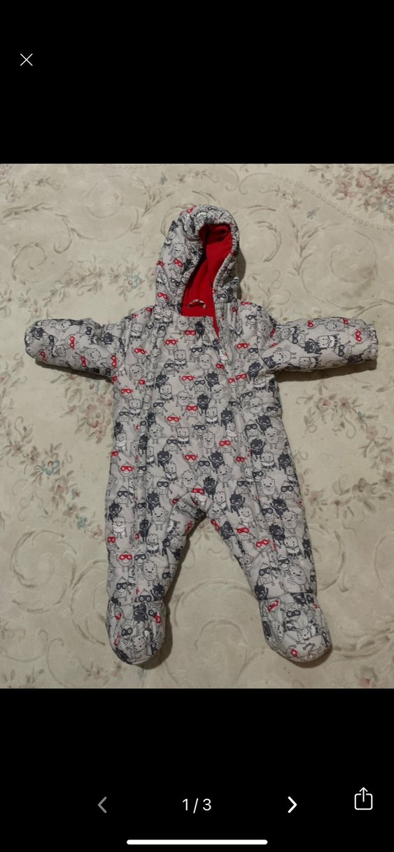 Gri renkte, kapüşonlu ve kürklü detaylı, yumuşak ve sıcak kumaştan yapılmış bebek tulumu. Sokak stilinde, baykuş desenlidir.