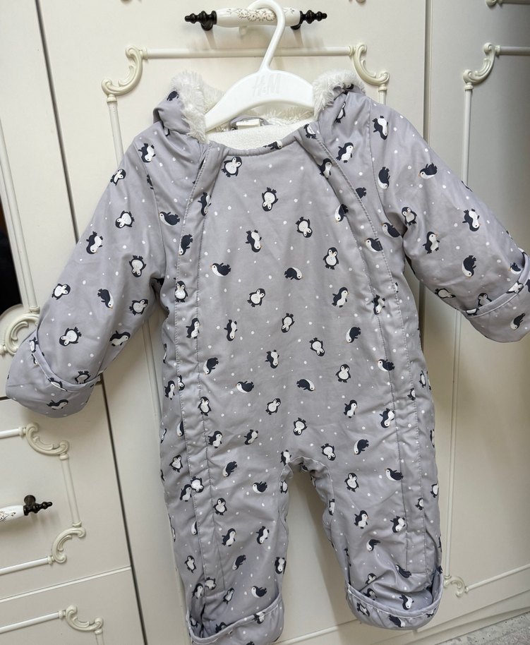 Gri renkte, kapüşonunda yumuşak kürk detaylı, küçük penguen desenli bebek tulumu. Çok sıcak tutuyor tek kat kıyafet üzerine giydirip dışarı çıkarabilirsiniz bebeğinizi. ❄️