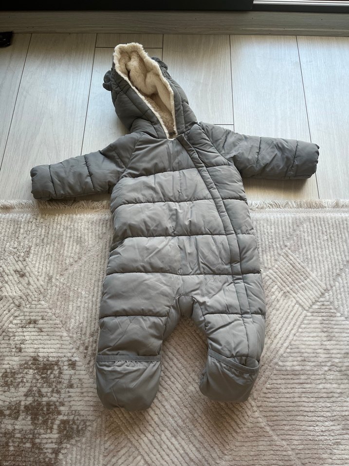 Kürklü kapüşonlu gri bebek tulumu, yumuşak ve sıcak kumaştan. Tam fermuarlı ve ayaklı tasarımıyla ekstra koruma sağlar. 6-9 ay