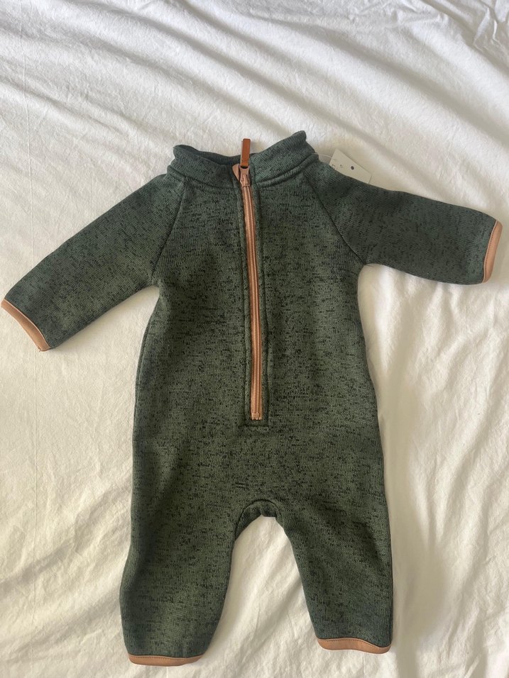Bu bebek tulumu, örgü dokusu ve yumuşak, sıcak kumaşıyla gri renkte, kahverengi detaylara sahip. Önden fermuarlıdır. ❄️