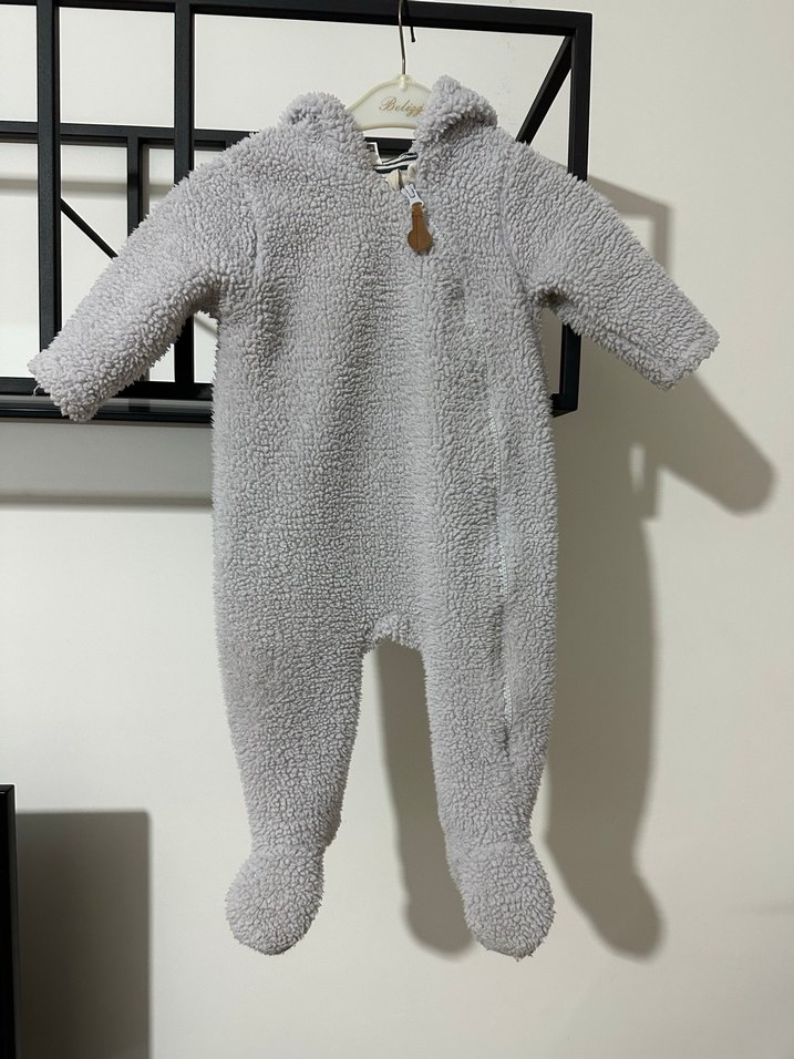 Gri bebek tulumu, kapüşonlu ve ayaklı tasarımıyla yumuşak ve sıcak dokuda hazırlanmıştır. 9/12 ay