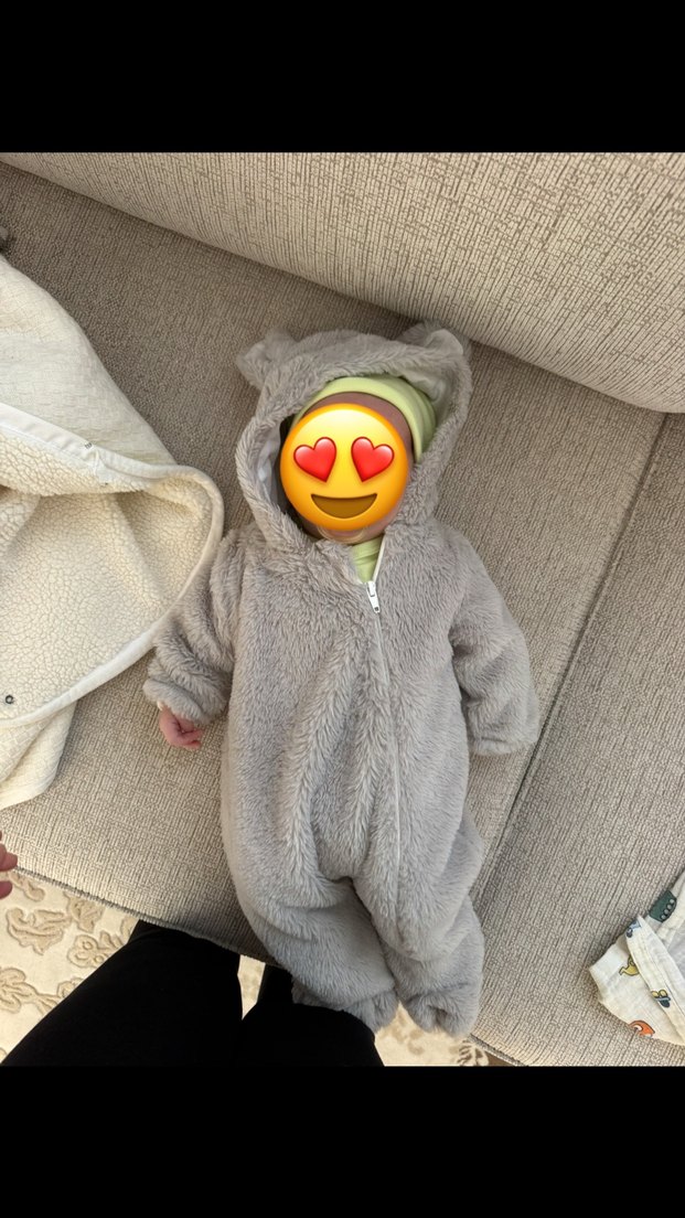 Gri renkte, yumuşak ve sıcak kumaştan yapılmış, kürk bebek tulumu. Küçük kulaklı kapüşonlu modele sahip.
